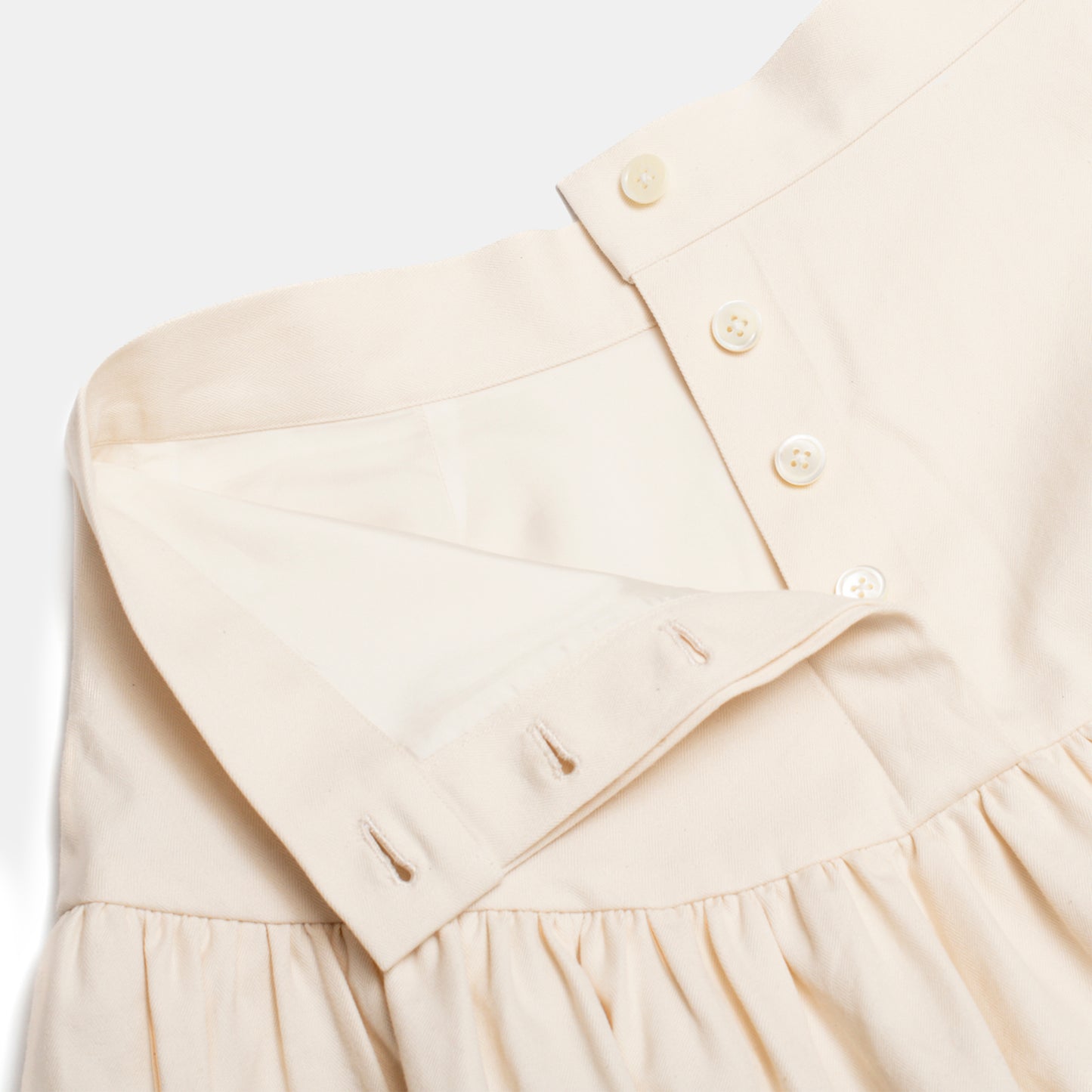 Inspired by the 1940s westernwear, the vintage-pattern-based rodeo skirt is made with a fitted waistband, a buttoned front closure and in-seam side pockets. It fits snug through the hips; gathered to a shaped yoke and flares out to midi length.