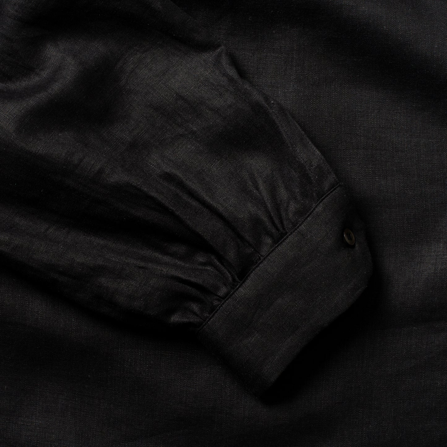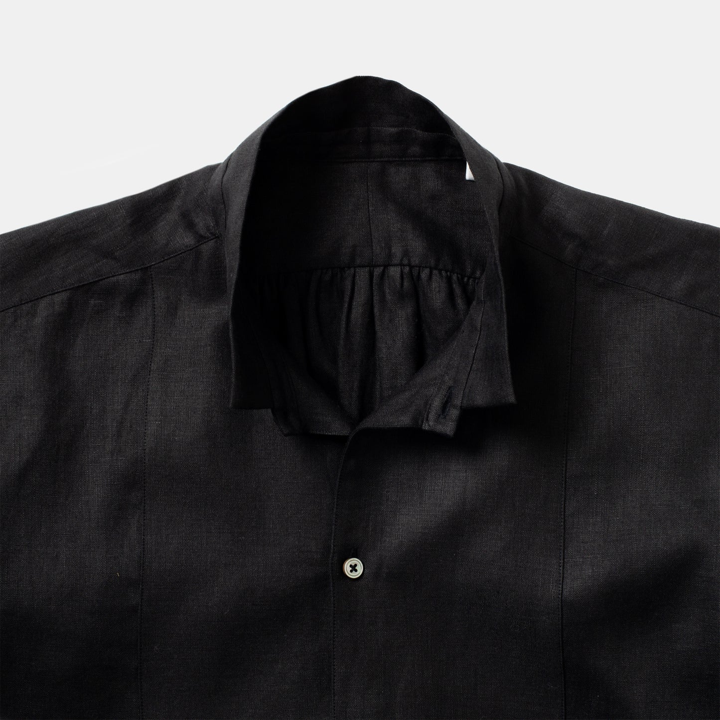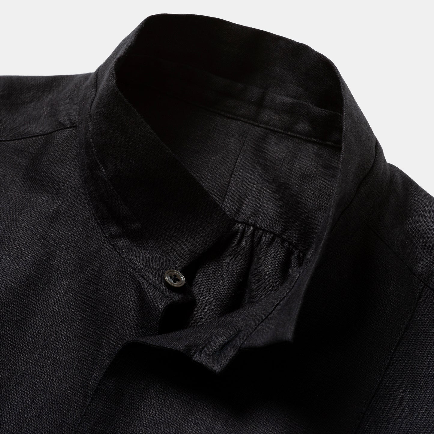 A long pull over, with a bibbed front that has been pleated below the placket to create fullness through the body, the farmer smock is cut full, with shirred pleats at the yoke and cuff. With a small stand collar that can be pressed to a wing collar or left soft and straight, it falls mid thigh reminiscent of traditional garments from the Far East, despite its European provenance.